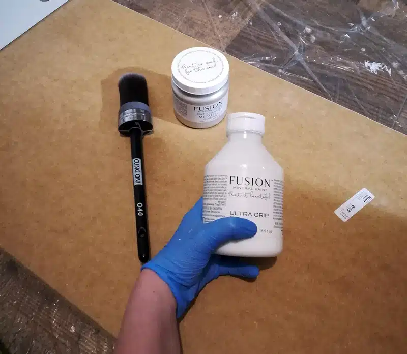 Fusion Ultra Grip – bo o tym produkcie mowa, zwiększa przyczepność na powierzchniach typu laminat, lakier, wysoki połysk, szkło czy plastik. Ma mleczny kolor, łatwo się rozprowadza, a po pomalowaniu nim powierzchnia staje się lekko chropowata. O to właśnie chodzi, bo dzięki temu preparat lepiej przylega do mebla, a i sama farba lepiej się go trzyma. Po całkowitym wyschnięciu warto przeszlifować powierzchnię drobniuteńkim papierem ściernym dla uzyskania większej gładkości (ale bardzo delikatnie papierem np. 320-500) i gotowe! Na takim podłożu pędzel nie ślizga się po meblu, jak łyżwiarz na lodowisku. Ci, którzy malowali meble z płyty, wiedzą pewnie o czym mówię.