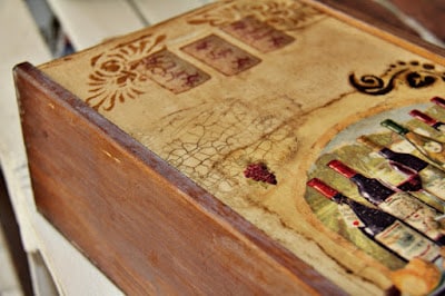 A tu skrzynka postarzana przy użyciu bitumu w płynie, białego wosku oraz spękań dwuskładnikowych oraz drewno malowane bardzo cienko ciemną bejcą, a następnie bielone woskiem.