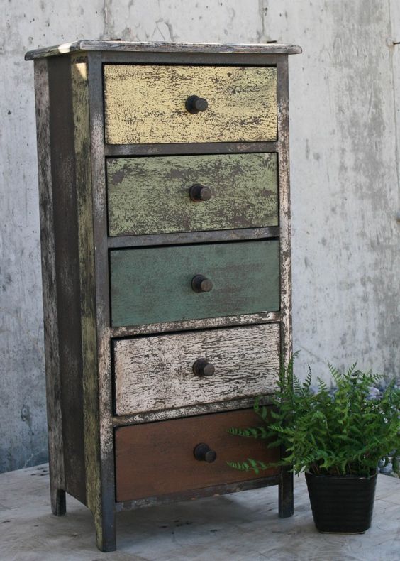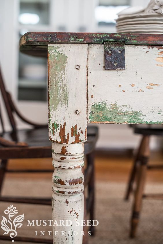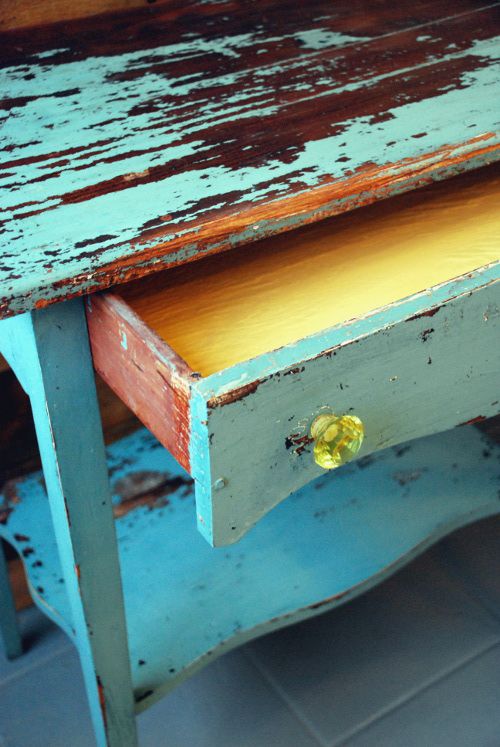 Nieco inaczej wyglądają przecierki w stylu CHIPPY LOOK (z ang. chippy –agresywny/bojowy, znowu moje skojarzenie: żołnierz na poligonie :)). Sama nazwa wskazuje już, że przecierki tutaj są dużo mocniejsze. Bardziej widoczne, pożądany jest efekt obdrapania i łuszczącej się, odchodzącej farby, spod której widać kolejne warstwy farb. Tak – mebel powinien być malowany warstwowo dwoma lub więcej kolorami, tak aby obtarcia uwidoczniły każdy z kolorów. Przetarcia mogą występować w każdym miejscu, nie tylko na rantach, ale także na głównych elementach, jak np. blaty. W przeciwieństwie do delikatnego shabby chic, chippy look to głównie mocne, intensywne barwy: turkusy, zielenie, czerwienie i inne (choć można też spotkać pastelowe chippy).